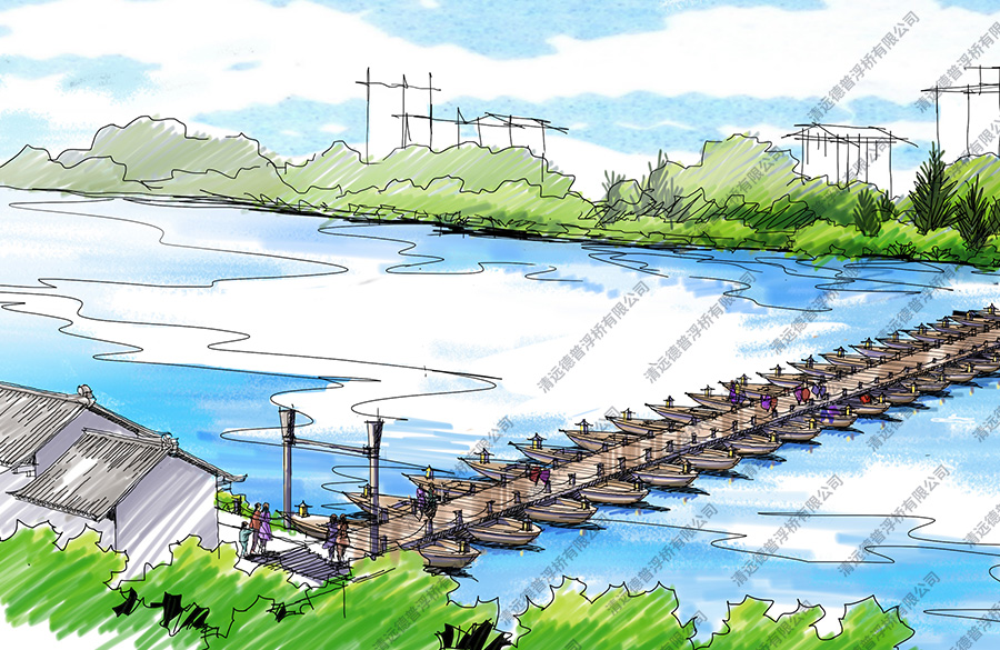 義烏市佛堂鎮萬善舟橋位于義烏江佛堂鎮段,上游擬建伏虎橋,下游擬建渡馨橋,北岸為新規劃古鎮保護開發利用區,南岸為舊街。為配合古鎮保護開發利用整體規劃,項目整體以還原萬善橋的原貌,以舟為載體,在“還原+創新”的理念下重新設計浮橋,項目以“舟橋、五頂亭、拱橋”三合一體,。舟橋根據實際使用需要,設置為總寬約4m,凈寬3.5m,總長約111m,主體受力結構為鋼結構,外包防腐木,上設方木欄桿整體呈仿古風格。萬善亭選用五頂亭,臺面呈一邊長為13.5m正方形,北岸平臺連接拱橋,南岸平臺連接舟橋引橋。拱橋連接萬善亭與北岸,總長約21m,總高約3.8m,橋面最寬處寬約5.6m,最窄處寬約2.8m,凈寬2.6m,整體呈拱式結構。