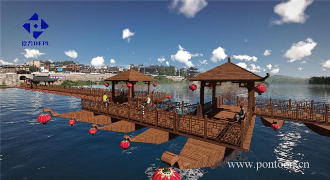 長(zhǎng)廊與亭子的造型采取與當(dāng)?shù)亟ㄖ嘟y(tǒng)一的翹腳設(shè)計(jì)。浮箱部分采取舟體作為載體,更具古典風(fēng)味,船頭和船尾的設(shè)計(jì)遵循了當(dāng)?shù)氐慕ㄖ厣?,與屋頂?shù)穆N腳極為類似,與周圍建筑環(huán)境完美結(jié)合,形成一個(gè)統(tǒng)一。