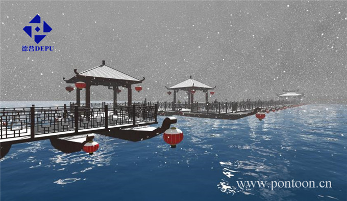 整座浮橋不僅極具特色更具文化背景熏陶,尤其舟體兩邊的燈籠晚上照亮整個(gè)湖面,在水中的倒影更是一道美麗的風(fēng)景。大雪紛飛的冬天,浮橋與涼亭及廊亭在雪中若隱若現(xiàn),給人一種幽深的感覺,仿若仙境,意境優(yōu)美,更有詩(shī)意。