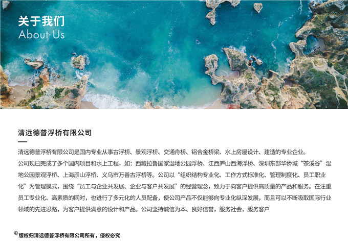 清遠德普浮橋有限公司專業(yè)制造交通浮橋、鋁合金橋梁、古浮橋、景觀浮橋等等。廠家實力雄厚,技術先進,產品種類齊全,質量保證。 具有國家標準認證,安全穩(wěn)固專家,工程質量精益求精,成功案例眾多,已為全國各地客戶搭建新式工程,品質認證... 標簽: 交通橋梁交通浮橋